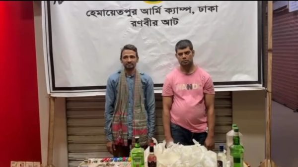 ঢাকা জেলা দক্ষিণ সাভার, ২ ফেব্রুয়ারি ২০২৬ ঢাকার সাভার সেনা ক্যাম্পের আওতাধীন হেমায়েতপুর বাসস্ট্যান্ড এলাকায় সেনাবাহিনীর একটি টহল দল অভিযান চালিয়ে মাদকসহ দুইজন মাদক কারবারিকে আটক করেছে। সেনা সূত্রে জানা