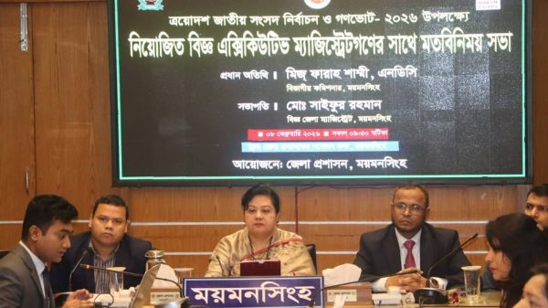 ত্রয়োদশ জাতীয় সংসদ নির্বাচন ও গণভোট-২০২৬ উপলক্ষ্যে নিয়োজিত বিজ্ঞ এক্সিকিউটিভ ম্যাজিস্ট্রেটগণের সাথে মতবিনিময় সভা অনুষ্ঠিত হয়। আজ ৮ ফেব্রুয়ারি রবিবার সকাল ৯.৩০ঘটিকায় ময়মনসিংহ জেলা প্রশাসনের আয়োজনে জেলা প্রশাসকের সম্মেলন কক্ষে